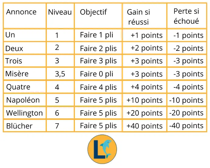 Pour connaître la correspondance des annonces et des points, veuillez regarder le tableau récapitulatif dans la section "Phase 1 : les enchères".