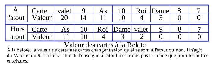 ► pour l'enseigne d’atout, la hiérarchie décroissante est Valet - 9 - As - 10 - Roi - Dame - 8 - 7,