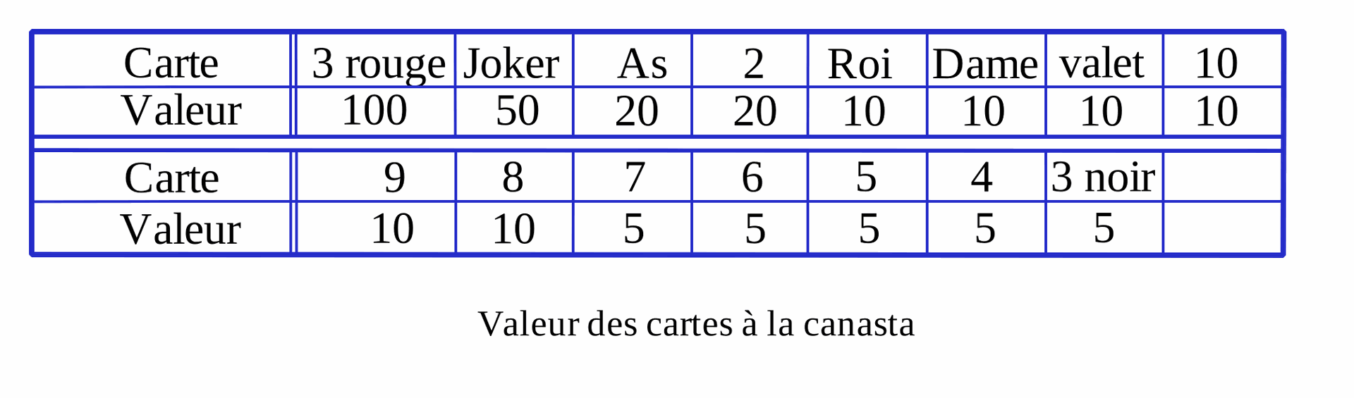 Les cartes ont une valeur mais n’ont pas de hiérarchie à la canasta.